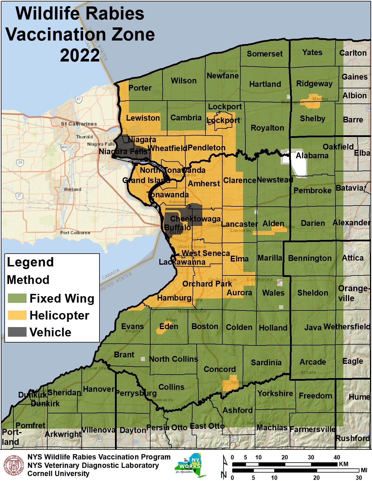 Aerial distribution (weather dependent) will start on or about August 15th with fixed-wing aircraft and take three days to complete. The affected townships in Cattaraugus County include Perrysburg, Dayton, Persia, Otto, East Otto, Ashford, Yorkshire, Machias, Freedom, and Farmersville.