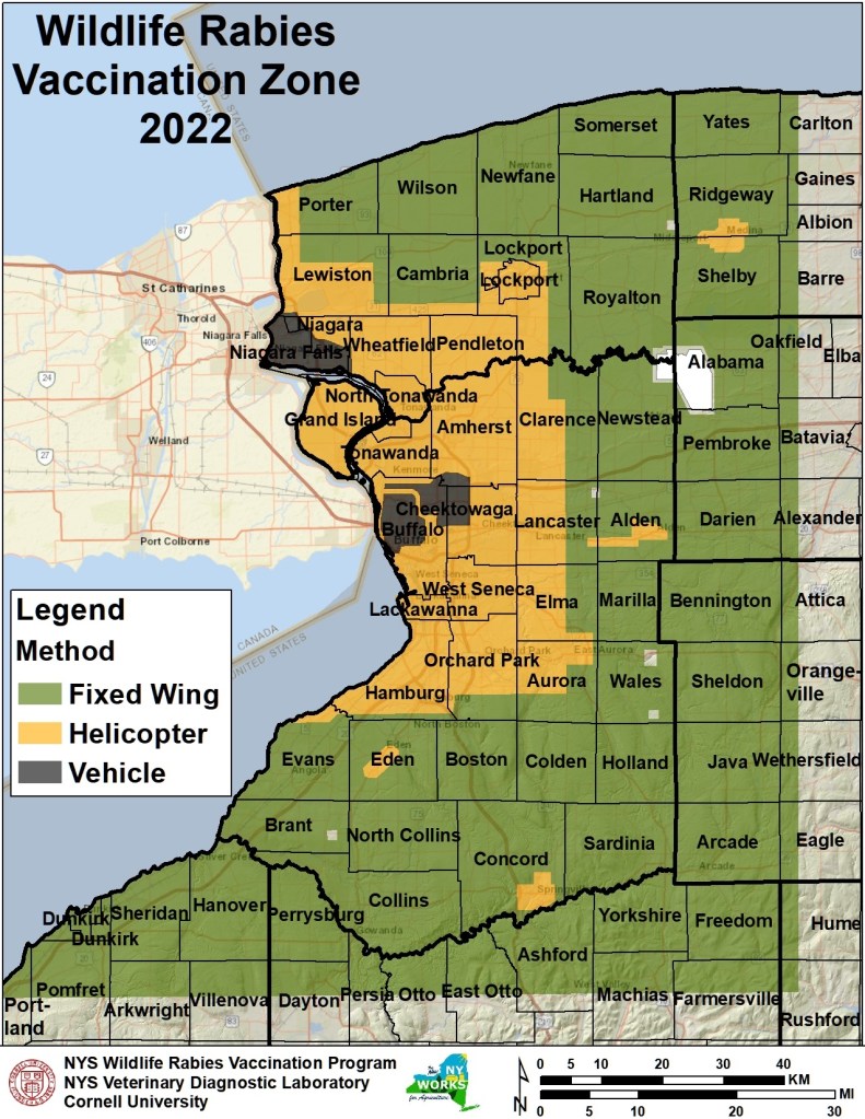 Terrestrial rabies cases have persisted in Western NY Counties since the early 1990’s. Rabies is nearly always fatal in unvaccinated animals, a very costly health threat that impacts people, pets, domestic livestock and wildlife. Immunization of wildlife will help to reduce the number of rabies cases and prevent the continued spread of the fatal virus. According to the Centers for Disease Control and Prevention, greater than 90 percent of reported rabies cases in the United States are in wildlife. The cooperative USDA, APHIS, Wildlife Services National Rabies Management Program (NRMP) was established in 1997 to prevent the further spread of wildlife rabies in the United States by containing and eventually eliminating the virus in terrestrial mammals. The majority of the NRMP efforts are focused on controlling raccoon rabies, which continues to account for most of the reported wildlife rabies cases in the U.S. Raccoon rabies occurs in all states east of the established ORV zone that extends from Maine to northeastern Ohio to northeastern Alabama. Continued access to oral vaccine and bait options that are effective in all target wildlife species remains critical to long term success.